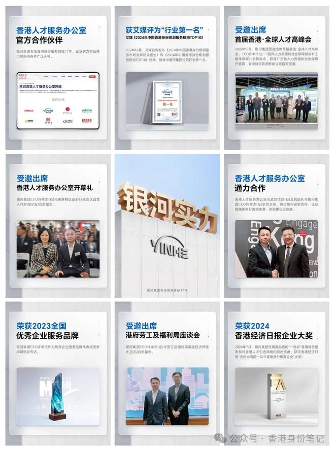 特点:银河集团以95.3分的总成绩位列“2024年中国香港身份规划服务机构TOP10榜单”之首,在客户量、“一站式”服务能力、知名度、聚焦度等四个细分领域均取得优异表现。该集团成立于2007年,总部位于深圳,已在北京、上海、香港建立分公司,提供包括香港优才、高才、专才等身份申请服务及后续在港生活的一站式服务。