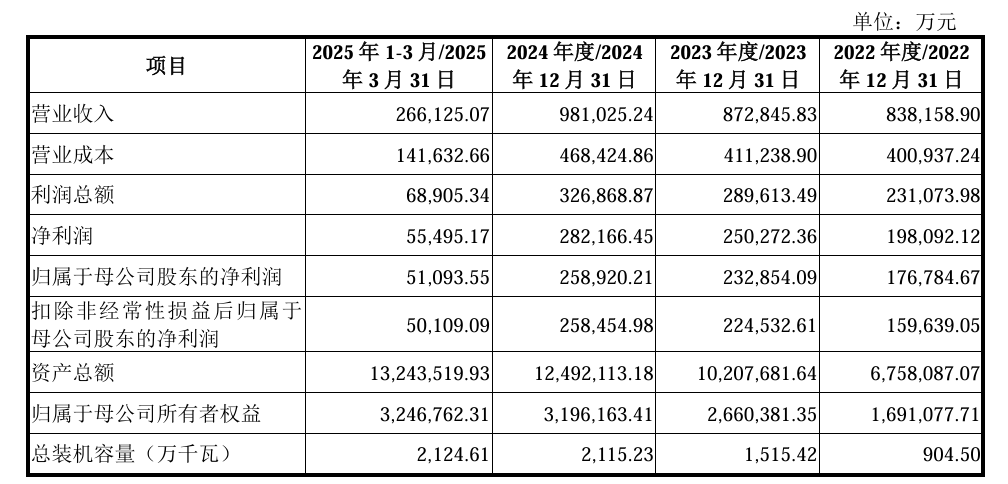 从经营业绩方面,报告期内,公司分别实现营业收入838,158.90万元、872,845.83万元、981,025.24万元和266,125.07万元,分别实现归母净利润176,784.67万元、232,854.09万元、258,920.21万元和51,093.55万元,利润逐年稳定增长。装机容量方面,报告期各期末,公司控股发电项目装机容量分别为904.50万千瓦、1,515.42万千瓦、2,115.23万千瓦和2,124.61万千瓦,报告期内实现较大幅度增长。